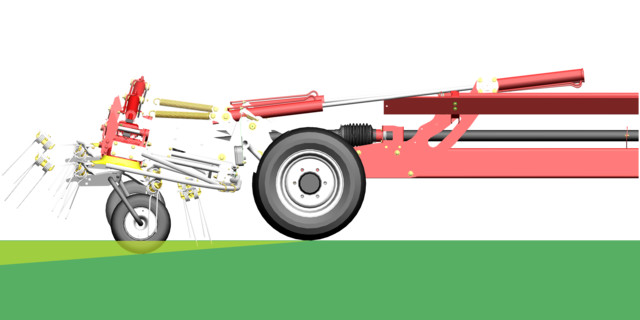 Before being raised, the rotors are positioned horizontally by a guide system and then lifted. This ensures that the tines do not scrape against the ground.